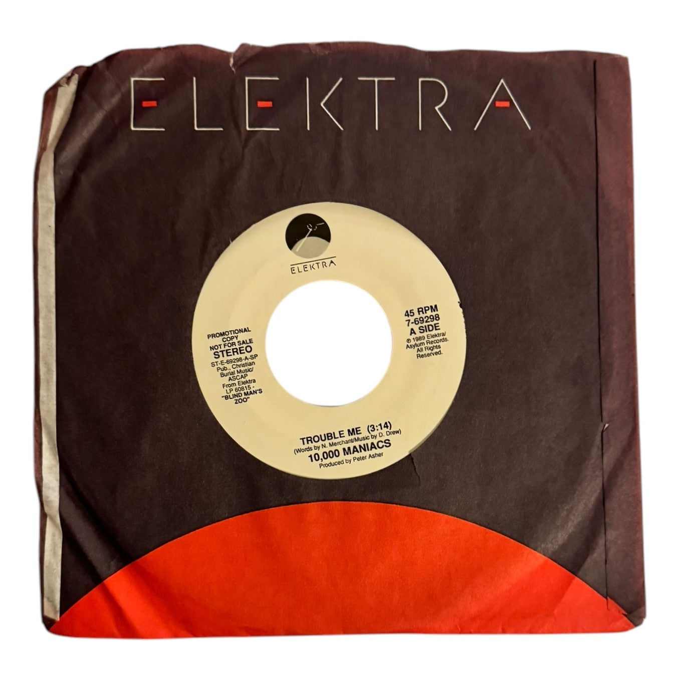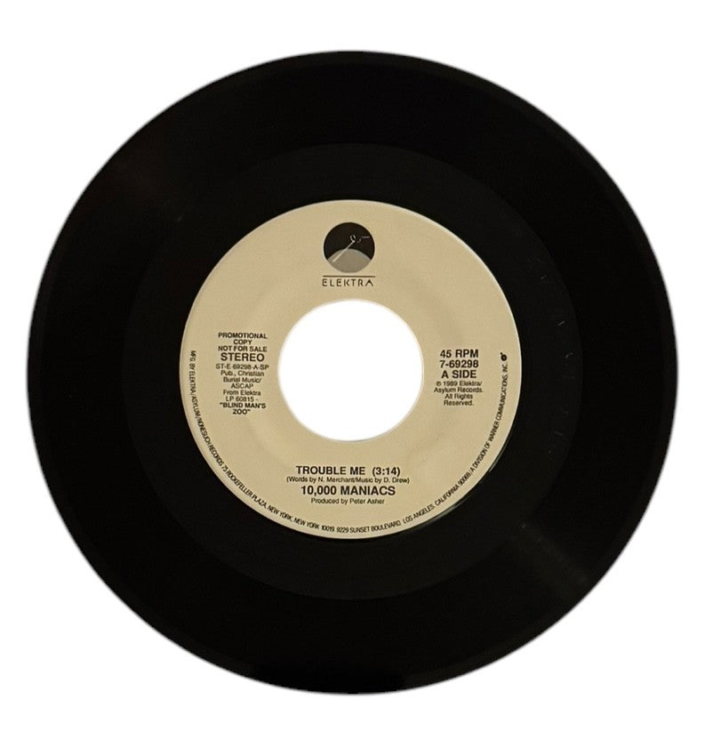 Trouble Me is a song by the American alternative rock group 10,000 Maniacs, and the first single from their 1989album Blind Man's Zoo. The single was co-written by the band's then-lead singer, Natalie Merchant, as a dedication to her father, Anthony Merchant. "Trouble Me" charted in both the United States and the United Kingdom, becoming a hit for the band. It peaked at number 44 on the Billboard Hot 100 chart. This single is a promo copy, and is in Very Good Plus condition. It's got a slammin' original record company sleeve.