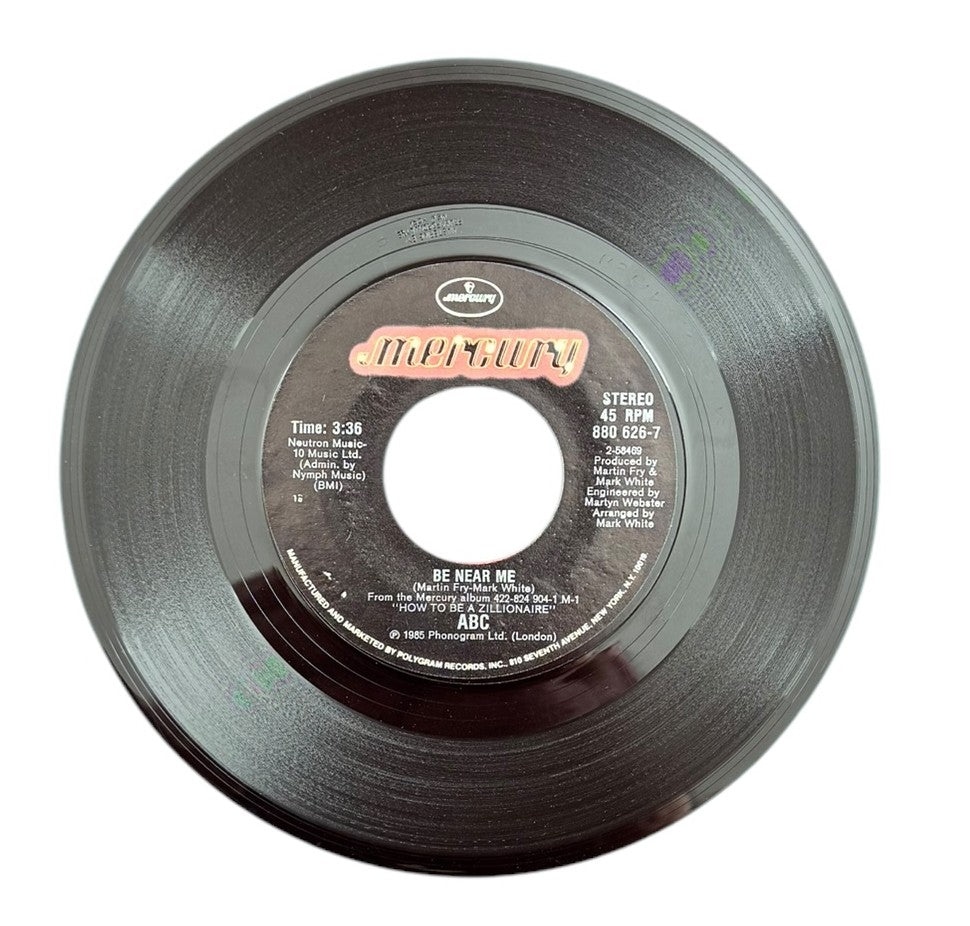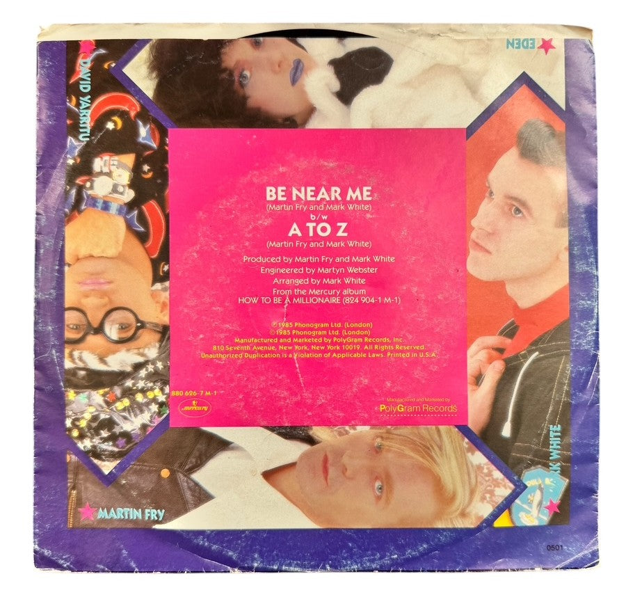 Be Near Me is a song by English pop band ABC. It was released in April 1985 as the second single from their third studio album, How to Be a...Zillionaire. It reached No. 9 on the Billboard Hot 100, and also went to No. 1 on the U.S. Hot Dance Club Play chart in September of that year, remaining on top for two weeks. This single is in Very Good Plus condition. The original picture sleeve is in Very Good condition with some minor wear.