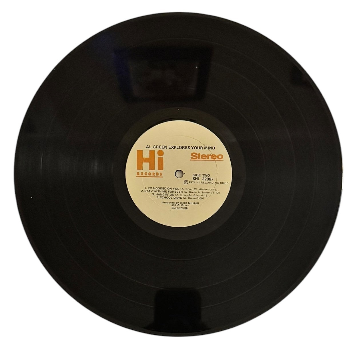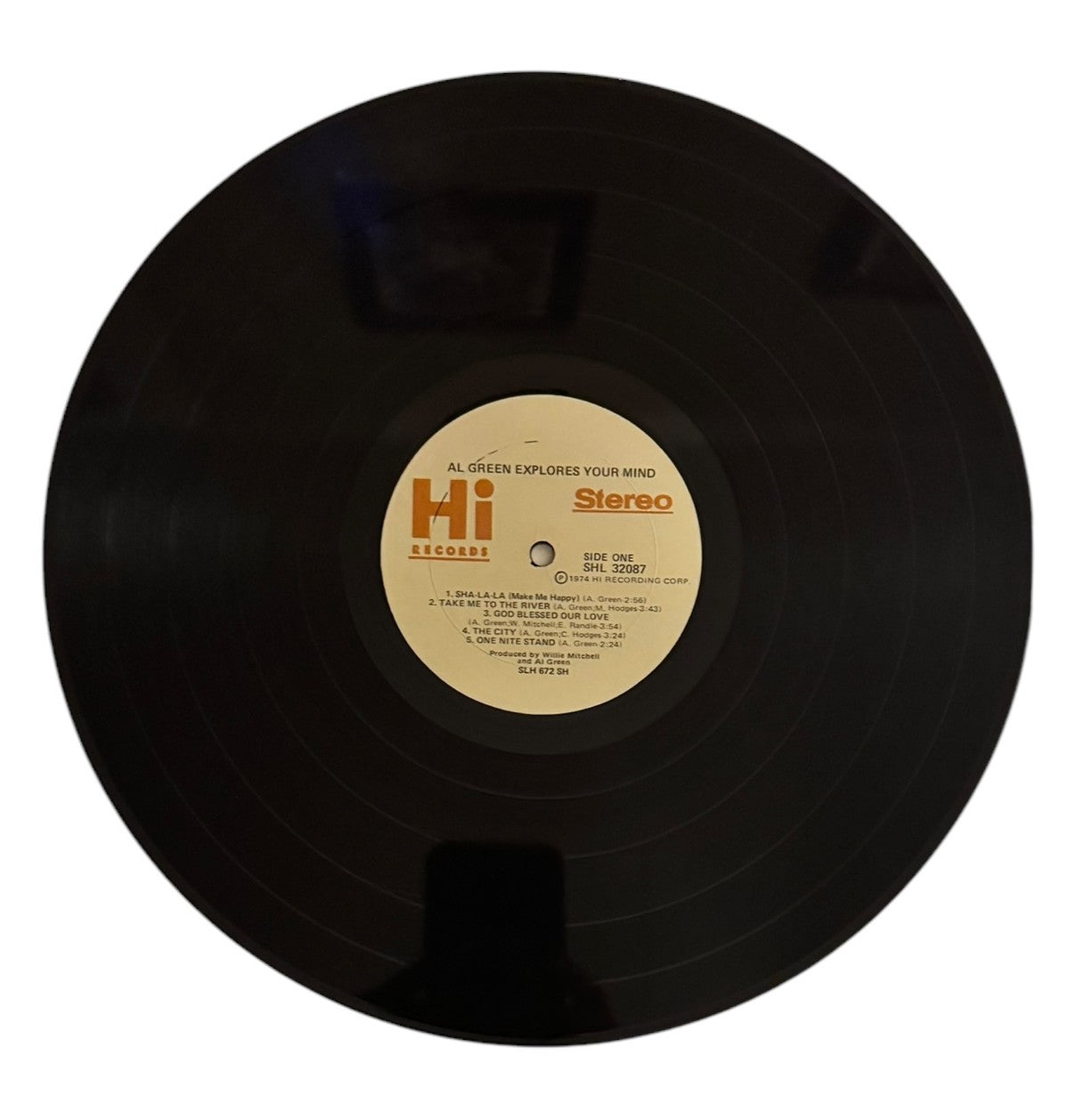 Al Green Explores Your Mind is the eighth album by soul singer Al Green. Unlike previous Al Green albums, this album featured only one major hit, "Sha-La-La (Make Me Happy)" which peaked at number 7 on the U.S. Billboard Hot 100 the week of December 21, 1974, but did contain the original version of "Take Me to the River," a song which went to number 26 on the Billboard chart when covered by Talking Heads in 1978. The album was his fifth consecutive album to claim number 1 on the Soul Albums chart, and peaked at number 15 on the Pop Albums chart. This record is in strong Very Good condition. The sleeve is in Good Plus condition, with some wear and a name written on the front.