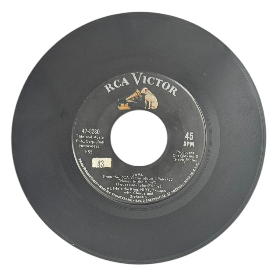 Al Hirt was an American trumpeter and bandleader. He is best remembered for his million-selling recordings of this song, Java, and for the theme music to The Green Hornet. His nicknames included "Jumbo" and "The Round Mound of Sound." RCA Victor, for which Hirt had recorded most of his best-selling recordings and for which he had spent most of his professional recording career, had simply dubbed him "The King." Java is an instrumental adaptation from a 1958 LP of piano compositions, The Wild Sounds of New Orleans, by Tousan, also known as New Orleans producer/songwriter Allen Toussaint. As was the case of the rest of Toussaint's LP, Java was composed in studio, primarily by Toussaint. In 1963, Hirt recorded the instrumental, and the track was the first single from his album Honey In The Horn. It was Hirt's first and biggest hit on the US pop charts, reaching number 4 on the Billboard Hot 100 on February 29, 1964 and spending four weeks at number 1 on the Easy Listening chart in early 1964. This single is in Very Good Plus condition with a small number sticker on the side A label, and comes with a sparkly original record company sleeve.