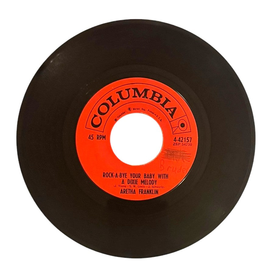 Rock-A-Bye Your Baby With A Dixie Melody is a popular song written byJean Schwartz, with lyrics by Sam M. Lewis and Joe Young. The song was introduced by Al Jolson in the Broadway musical Sinbad and published in 1918. Aretha Franklin's version, released in 1961, reached number 37 on the Billboard Hot 100 chart. This single is in Very Good Plus condition with some writing on the side A label in pencil, and comes with a spiffy original record company sleeve.
