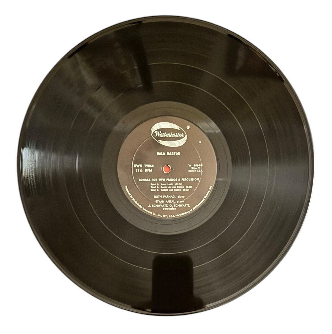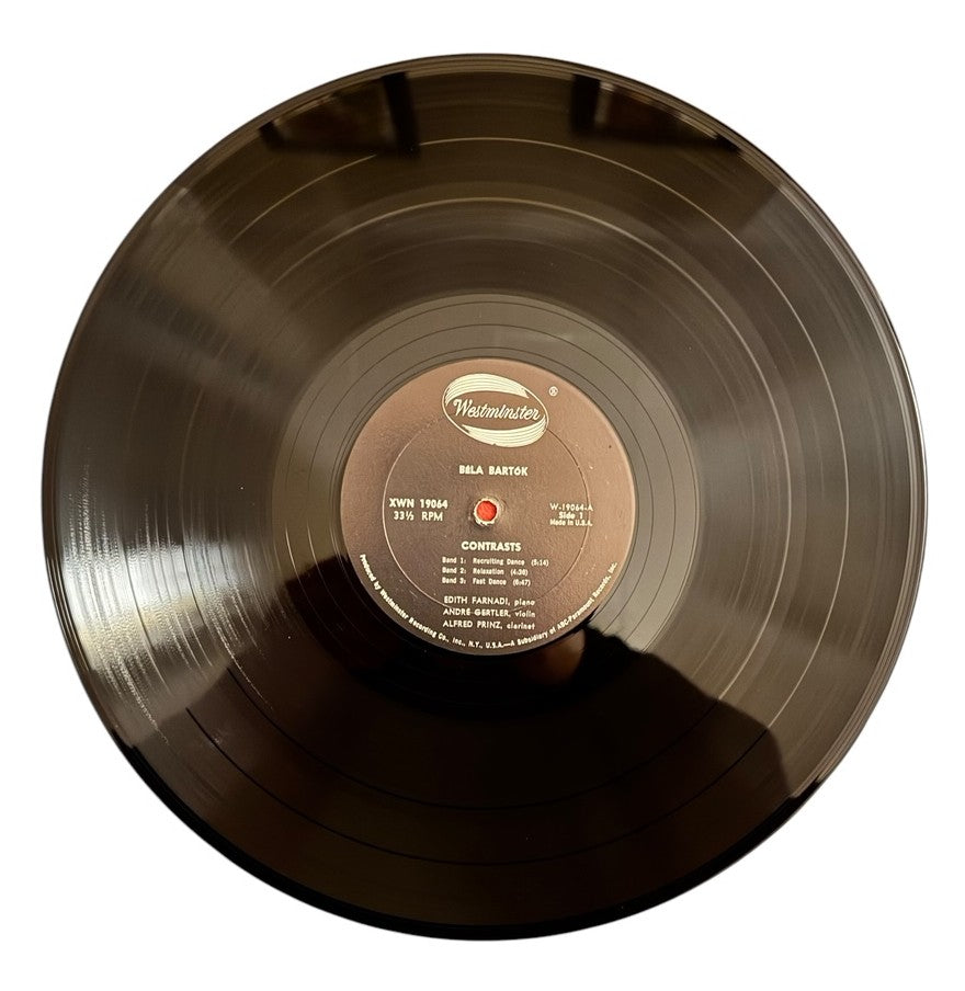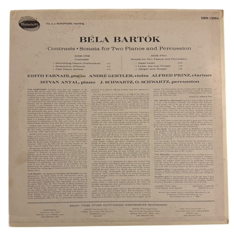 This record contains two pieces by Bela Bartok. The first is Contrasts, a 1938 composition. It is based on Hungarian and Romanian dance melodies and has three movements with a combined duration of 17–20 minutes. Bartók wrote the work in response to a letter from violinist Joseph Szigeti, although it was officially commissioned by clarinetist Benny Goodman. The piece was written for piano, violin, and clarinet, and here is played by Edith Farnadi on piano; Andre Gertler on violin; and Alfred Prinz on clarinet. The second piece on the record is Sonata For Two Pianos And Percussion. The sonata was premiered by Bartók and his second wife, Ditta Pasztory-Bartok, with the percussionists Fritz Schiesser and Philipp Rühlig in 1938. It has since become one of Bartók's most performed works. Here it is played with Edith Farnadi and Istvan Antal on piano and J. Schwartz and O. Schwartz on percussion. This record and its sleeve are both in Very Good Plus condtion.