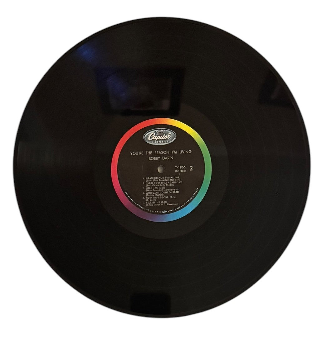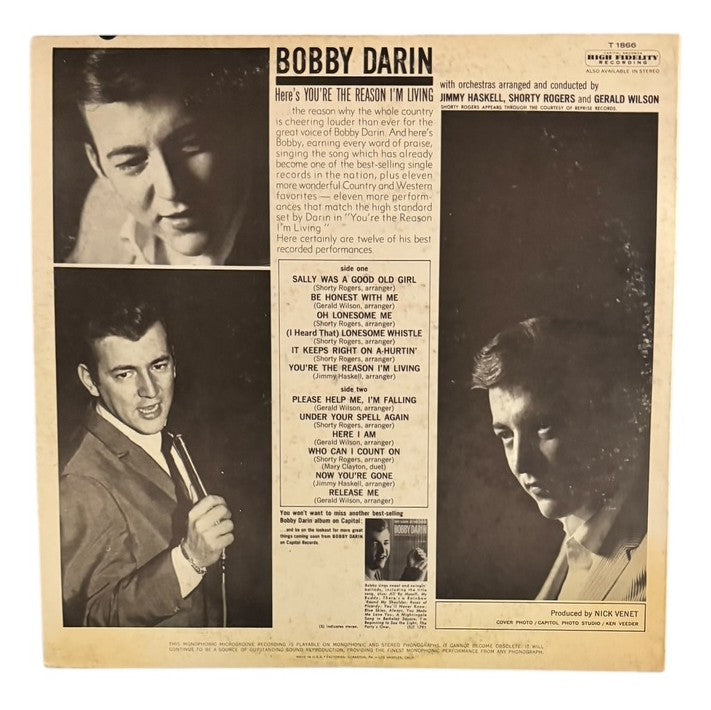 You're The Reason I'm Living is a studio album by the American singer Bobby Darin, released in February 1963. It contains country and western music, often with a big band twist, and features arrangements by Jimmie Haskell, Shorty Rogers, and Gerald Wilson. The title track was a number three hit single. The album debuted on the Billboard Top LPs chart in the issue dated March 16, 1963, and remained on the chart for 15 weeks, peaking at number 43. This record is in Very Good Plus condition, and its sleeve is in Very Good condition with some minor wear.