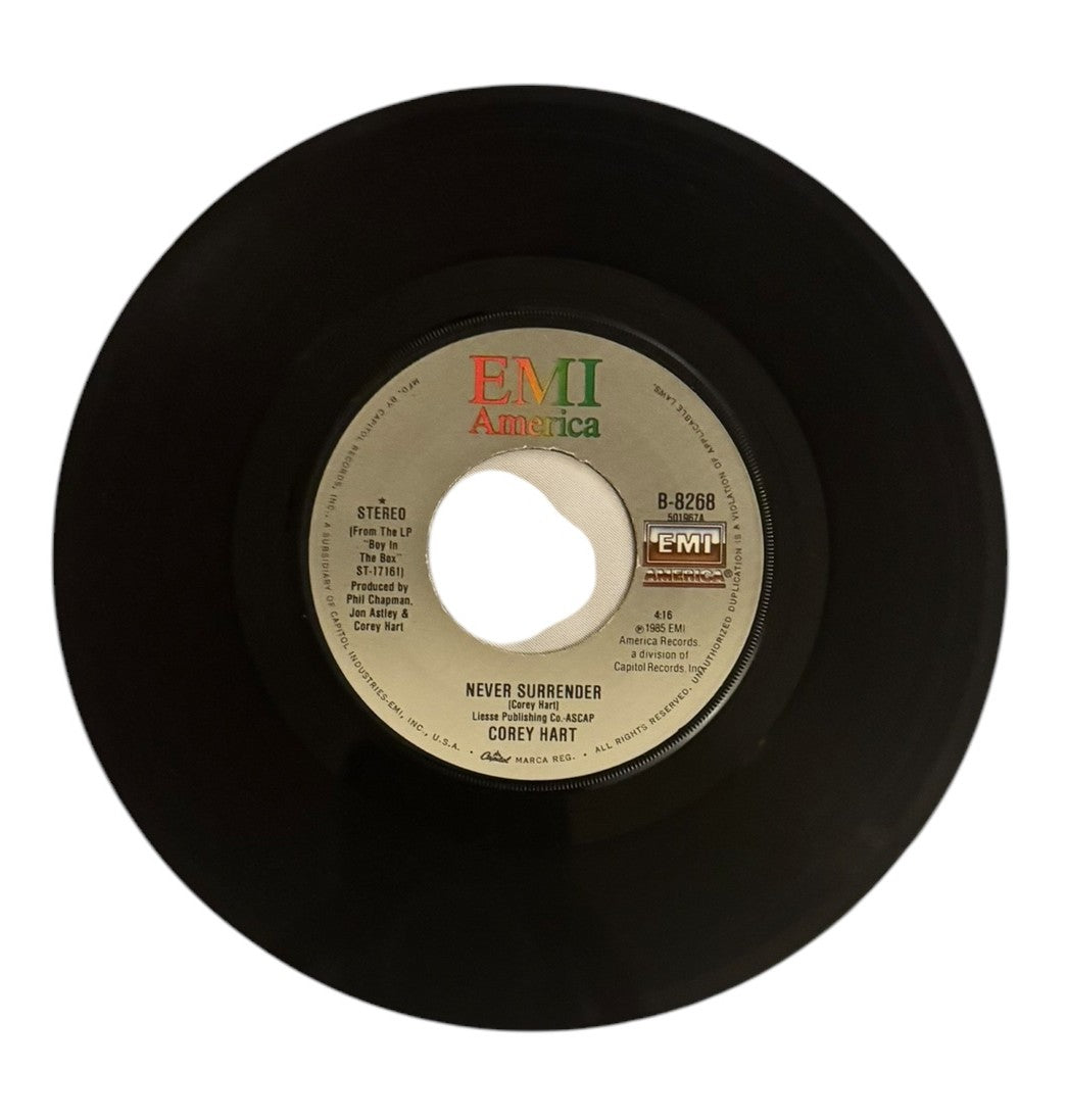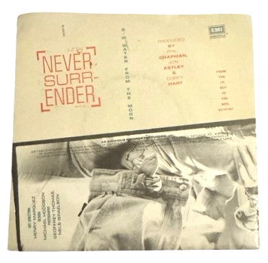 Never Surrender is a song written and performed by Canadian singer Corey Hart. It was released on June 7, 1985, as the lead single to his second studio album Boy In The Box. In the United States, it became his highest-charting single on the Billboad Hot 100, peaking at number 3 in August 1985; on the sales chart, it reached number 1 for one week. This single is in Very Good Plus condition, as is its original poster sleeve.