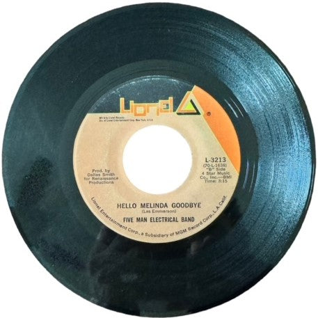 The Five Man Electrical Band (known as The Staccatos from 1963 to 1968) is a Canadian rock band from Ottawa, Ontario. They are best known for this 1971 hit single, Signs. It was written by the band's frontman, Les Emmerson, as he was traveling Route 66 while returning to Los Angeles from Canada and noticed all of the big signs and billboards obscuring his view of the natural scenery. The song popularized the relatively unknown band, who recorded it for their true first album, Good-byes And Butterflies, in 1970. Their actual first LP Five Man Electrical Band had begun as a Staccatos album with Brian Rading, the band's bassist suggesting the band's new name from the song title. This single is in Very Good Plus condition.