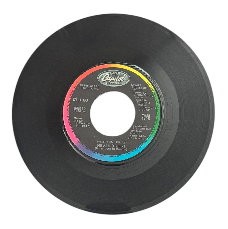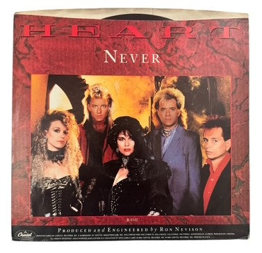 Never is a song by American rock band Heart, released on August 29, 1985, as the second single from the band's eponymous eighth studio album. It was written by Holly Knight, Gene Bloch (from the band Device) and "Connie" (a pseudonym for Ann Wilson, Nancy Wilson, and Sue Ennis). The song peaked at number 4 on the Billboard Hot 100. This single is in Very Good condition, and its original picture sleeve is in Very Good Plus condition.
