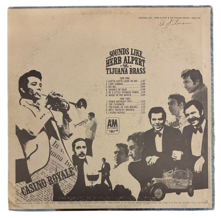 Herb Alpert is an American trumpeter, pianist, songwriter, record producer, arranger, conductor, painter, sculptor, and theatre producer, who led the band Herb Alpert & the Tijuana Brassin the 1960s. During the same decade, he co-founded A&M Records with Jerry Moss. Originally the Tijuana Brass was just Alpert overdubbing his own trumpet, slightly out of sync. The 1960s were full of hits for Alpert and his band, and in 1967, the Tijuana Brass performed Burt Bacharach's title cut to the first movie version of Casino Royalo on this album. This record is in Very Good Plus condition. The sleeve is in Very Good condition, with minor wear and a split spine.