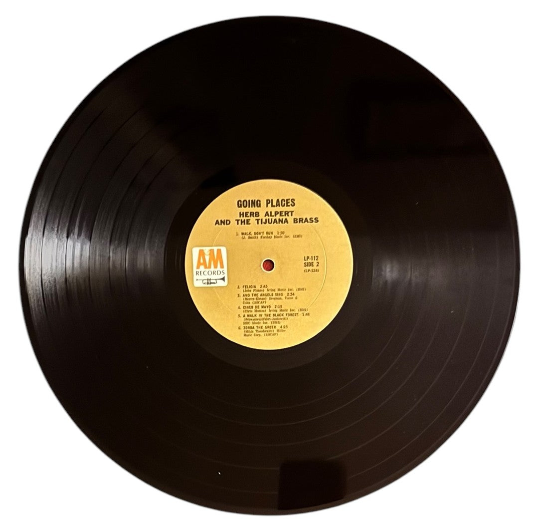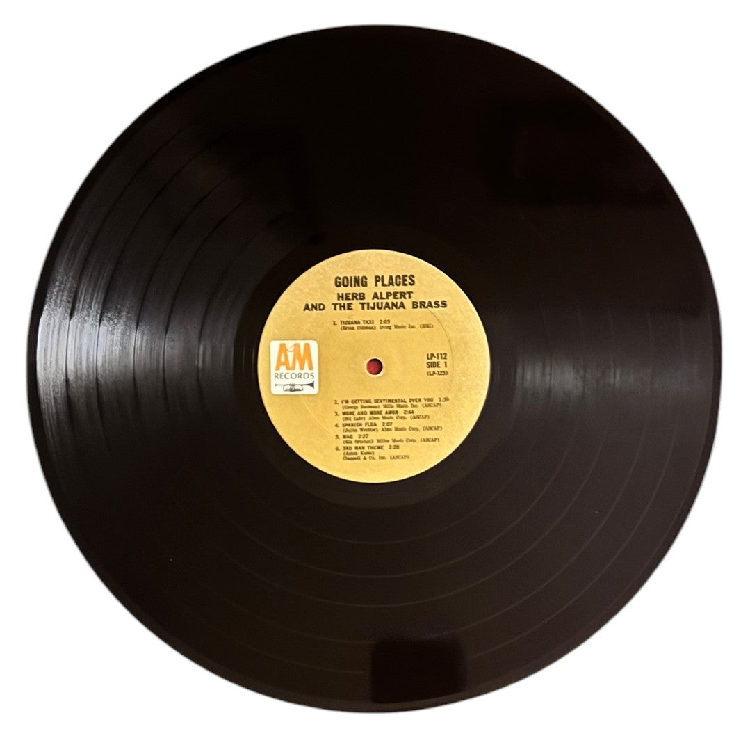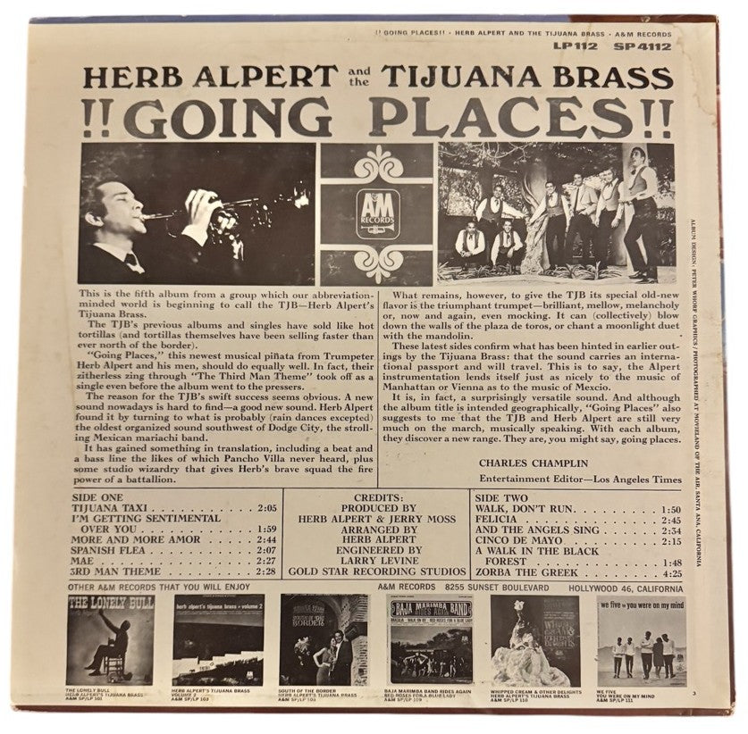 !! Going Places!! is the fifth album by Herb Alpert and The Tijuana Brass, and was released in 1965. The songs on Going Places are a mixture of sessions featuring Alpert's touring band and those with other session musicians. The spring and summer of 1966 was the high water mark of the band's album sales. For the week ending May 21, 1966, Going Places was one of five Tijuana Brass albums listed in the top 20 of Billboard's Top LPs, at No. 4. The others were What Now My Love, Whipped Cream & Other Delights, South Of The Border, and The Lonely Bull. This record and its sleeve are in Very Good Plus condition.