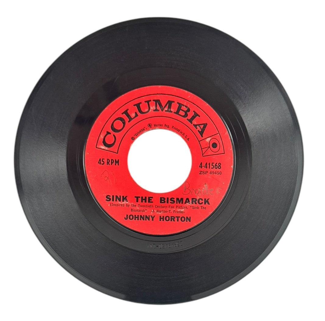 Johnny Horton was an American country, honky tonk, and rockabilly musician during the 1950s. He is best known for a series of history-inspired narrative country saga songs that became international hits. Horton had success in 1960 with this single, Sink The Bismarck. The song is a mach song by Horton and songwriter Tillman Franks, based on the pursuit and eventual sinking of the German battleship Bismarck in May 1941, during World War II. The song reached number 3 on the charts. As originally released, the record label used the common misspelling "Bismark"; this error was corrected for later releases of the song. It was inspired by the 1960 British war movie Sink The Bismarck! and was, with the producer John Brabourne's approval, commissioned from Horton by 20th Century Fox, who were worried about the subject's relative obscurity in the United States. Inexplicably, the size comparisons of guns and shells are switched. While the song was used in U.S. theater trailers for the film, it was not used in the actual film. This single is in Very Good condition, with some wear to the labels. It comes with a snazzy original record company sleeve.