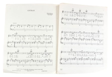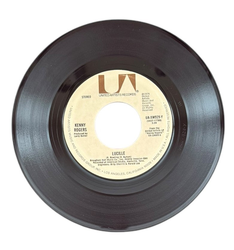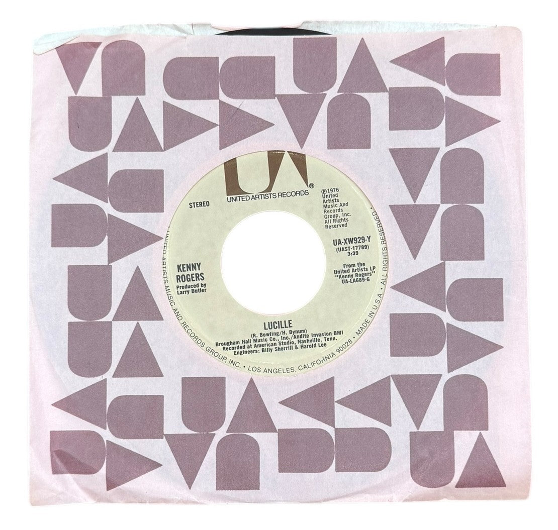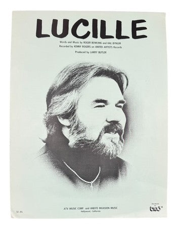 Lucille is a song written by Roger Bowling and Hal Bynum, and recorded by American country music artist Kenny Rogers. It was released in January 1977 as the second and final single from the album Kenny Rogers. It became Rogers' first major hit as a solo artist after leaving the successful country/rock group the First Edition the previous year. An international hit, it reached number one on the Billboard Country Singles chart and number 5 on the Billboard Hot 100. The song was nominated for the Grammy Award for Best Country Song and Rogers won the Grammy Award for Best Male Country Vocal Performance in 1978. This is the original sheet music for the song, and the vinyl single record. Both are in Very Good Plus condition. The record comes with an original record company sleeve.