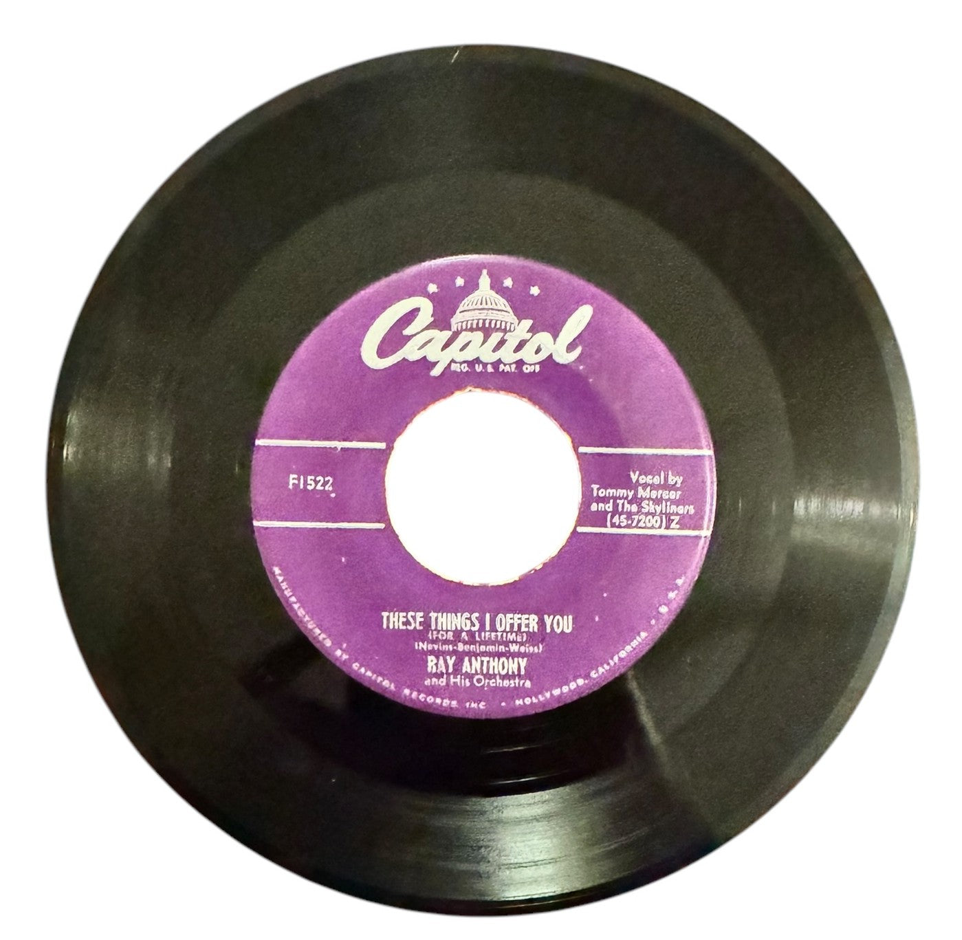 Ray Anthony is an American retired bandleader, trumpeter, songwriter and actor, and the last living member of the Glen Miller Orchestra. Anthony was born to an Italian family in Bentleyville, PA, but moved with his family to Cleveland, OH where he studied the trumpet. He played in Glenn Miller's band from 1940 to 1941 before joining the U.S. Navy during World War II. After the war he formed his own group, The Ray Anthony Orchestra, which became popular in the early 1950s. This song was released in 1951 and is from the musical show "Flahooley." This single is in Very Good Plus condition.