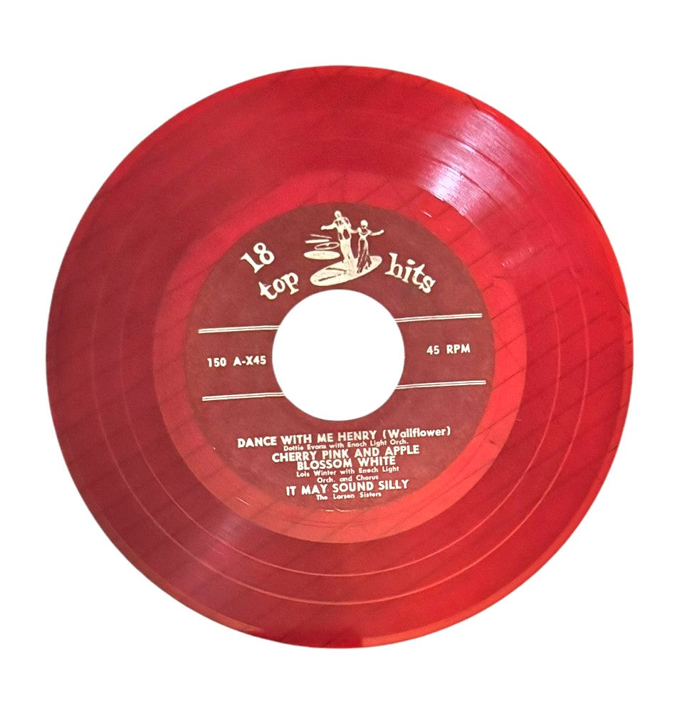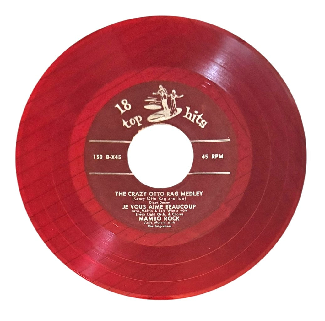 This 7" red vinyl single is actually an EP, issued in 1955 by 18 Top Hits Records, a budget label of Waldorf Record Corp., itself a budget label exclusively sold in Woolworth stores from 1954 to 1959. Enoch Light, who ran Waldorf Music Hall Records, was a major factor (both as a producer and musician) on most of these releases, which primarily comprised covers of popular songs from that era by various studio artists. Light is featured on three songs on this EP. The rare red vinyl single is in Very Good condition, but looks fabulous!